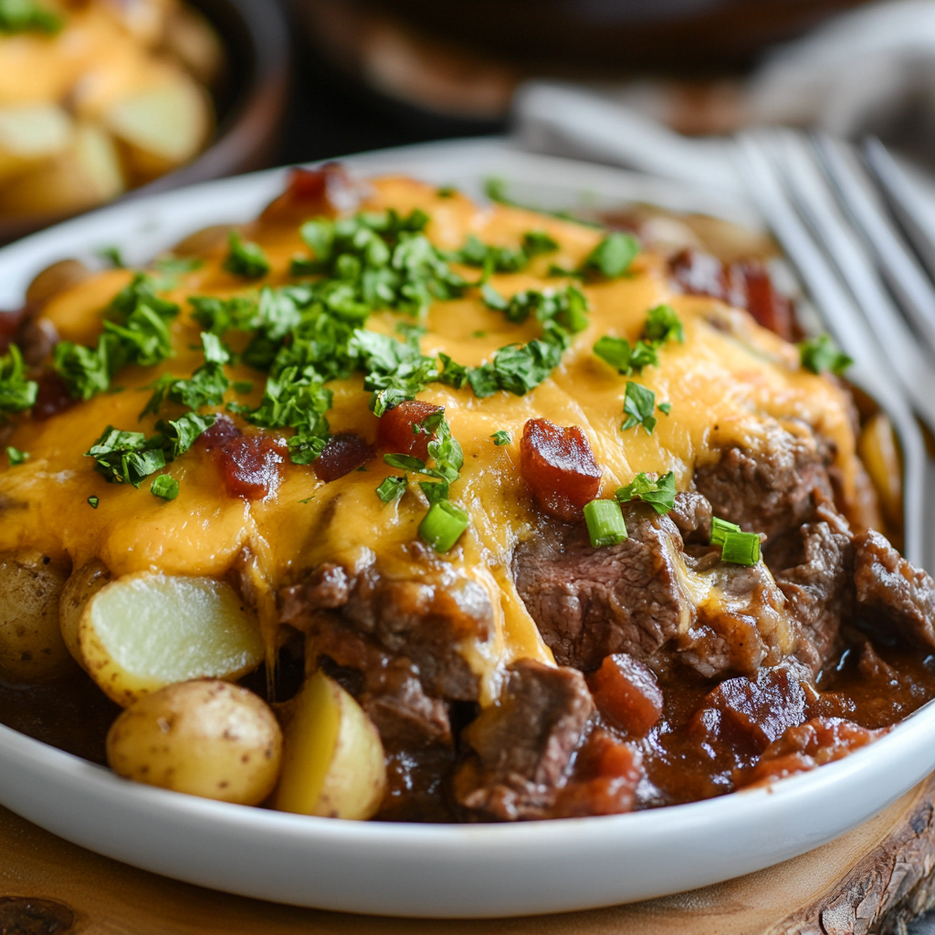 Between the seasoned steak, perfectly cooked potatoes, melty cheese, and smoky bacon, this dish delivers layers of bold, comforting taste.