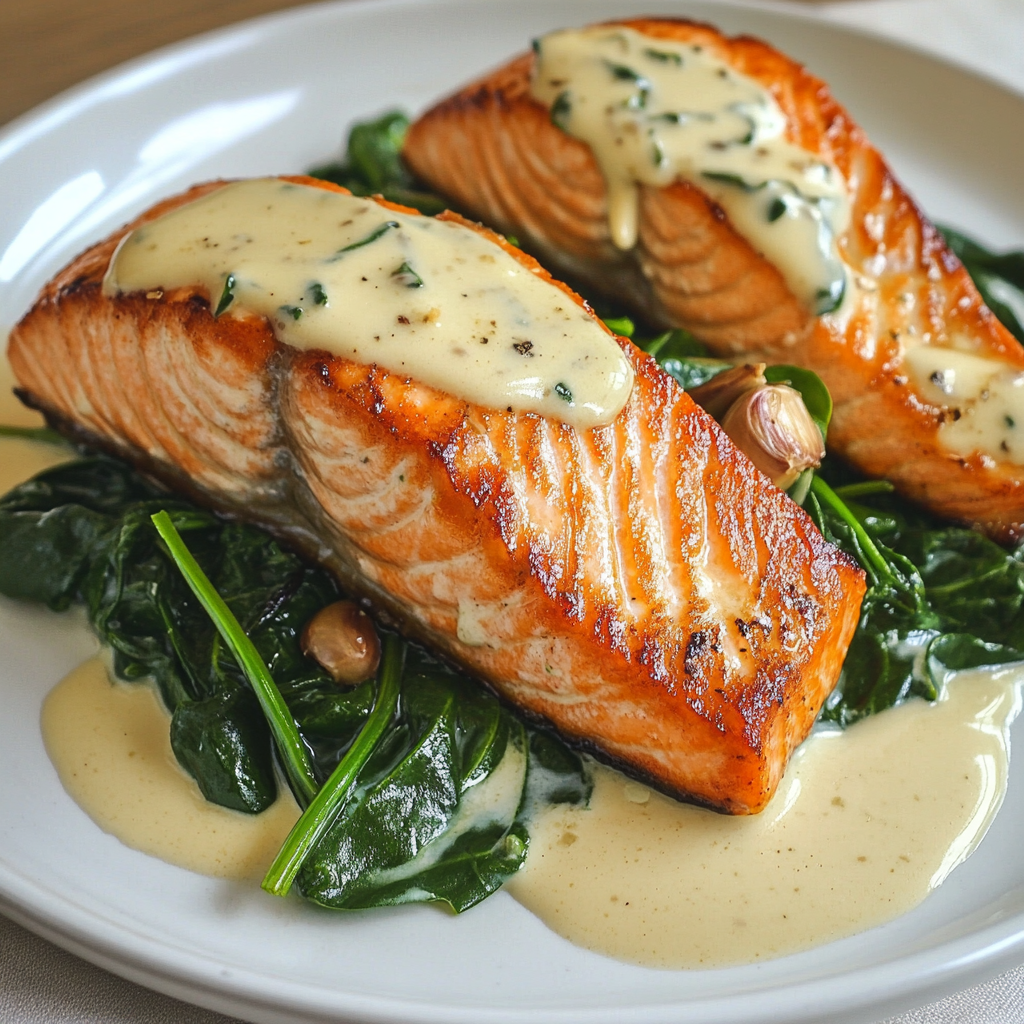 After a long day, you deserve a meal that’s nutritious, flavorful, and lightning-fast to prepare. This Garlic Butter Salmon & Spinach checks all the boxes—succulent pan-seared salmon swimming in a rich garlic butter sauce, paired with tender wilted spinach that soaks up every drop of that delicious pan sauce.