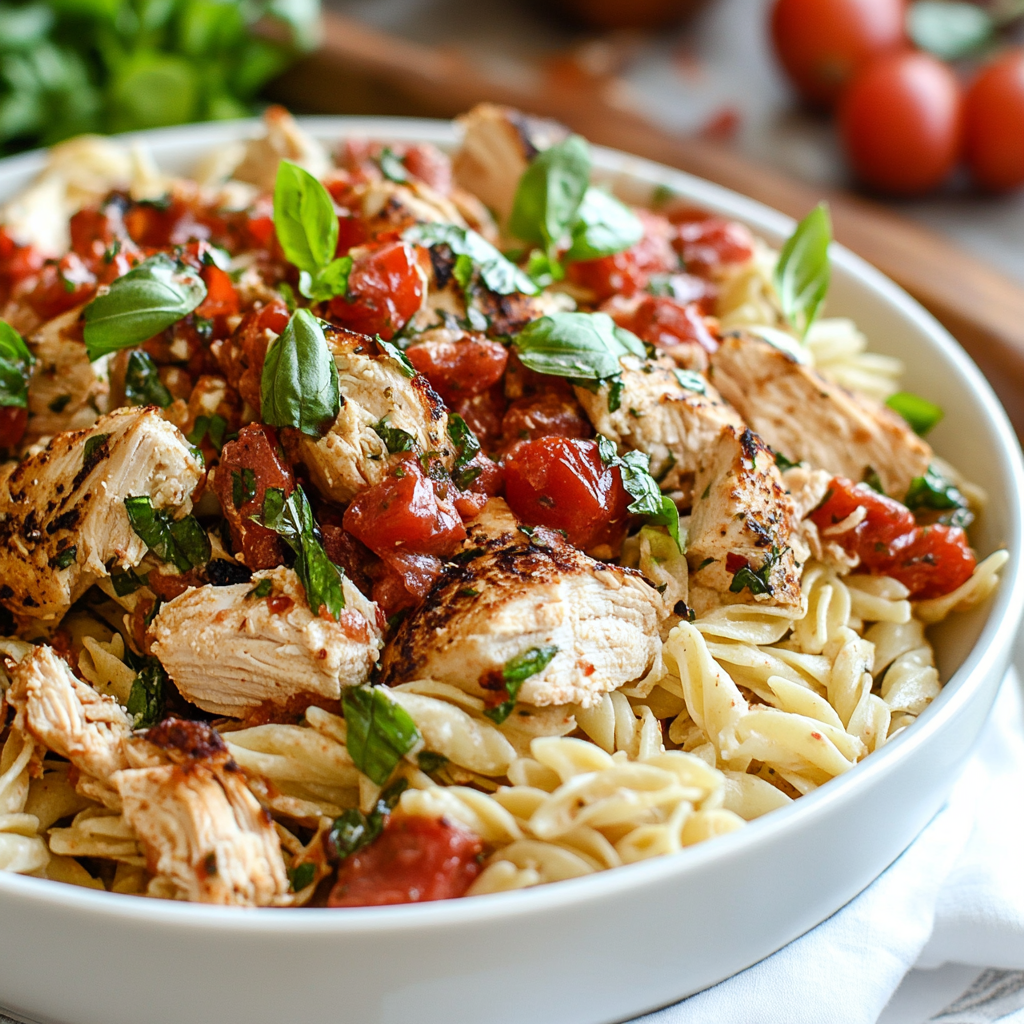 The Light & Delicious Chicken Bruschetta Pasta Salad is everything you want in a meal: flavorful, nourishing, versatile, and quick to prepare. It brings a little Mediterranean sunshine to your plate with its blend of bright tomatoes, fresh basil, savory chicken, and zesty balsamic dressing.