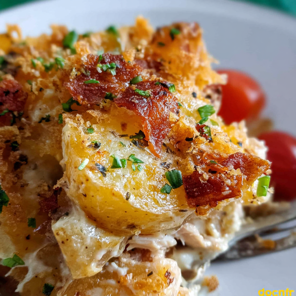 Potato Ranch Chicken Casserole is a layered baked dish that features juicy chunks of chicken and tender potatoes, all enveloped in a creamy ranch dressing-based sauce. The ranch seasoning adds a savory, tangy flavor that pairs beautifully with the mild sweetness of the potatoes and the richness of melted cheese. The casserole is baked until bubbly and golden brown on top, making every bite warm, comforting, and full of flavor.