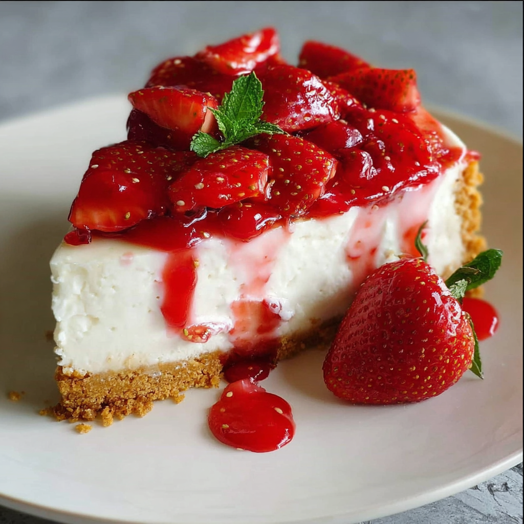 Before serving, top the cheesecake with fresh strawberry slices. For a glossy finish, brush with a strawberry glaze or gently heat strawberry jam and spread it over the fruit.